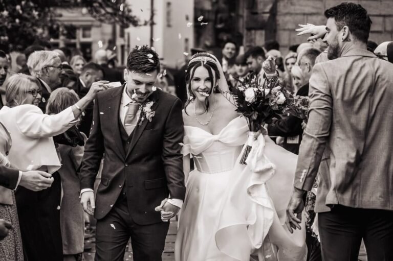 Before heading to the venue, the day began with a traditional church ceremony nearby. There is something incredibly special about capturing the “Confetti Exit” at a church gate—the joy on Lucy and Lewis’s faces as they walked out into a cloud of petals was one of the highlights of the day.